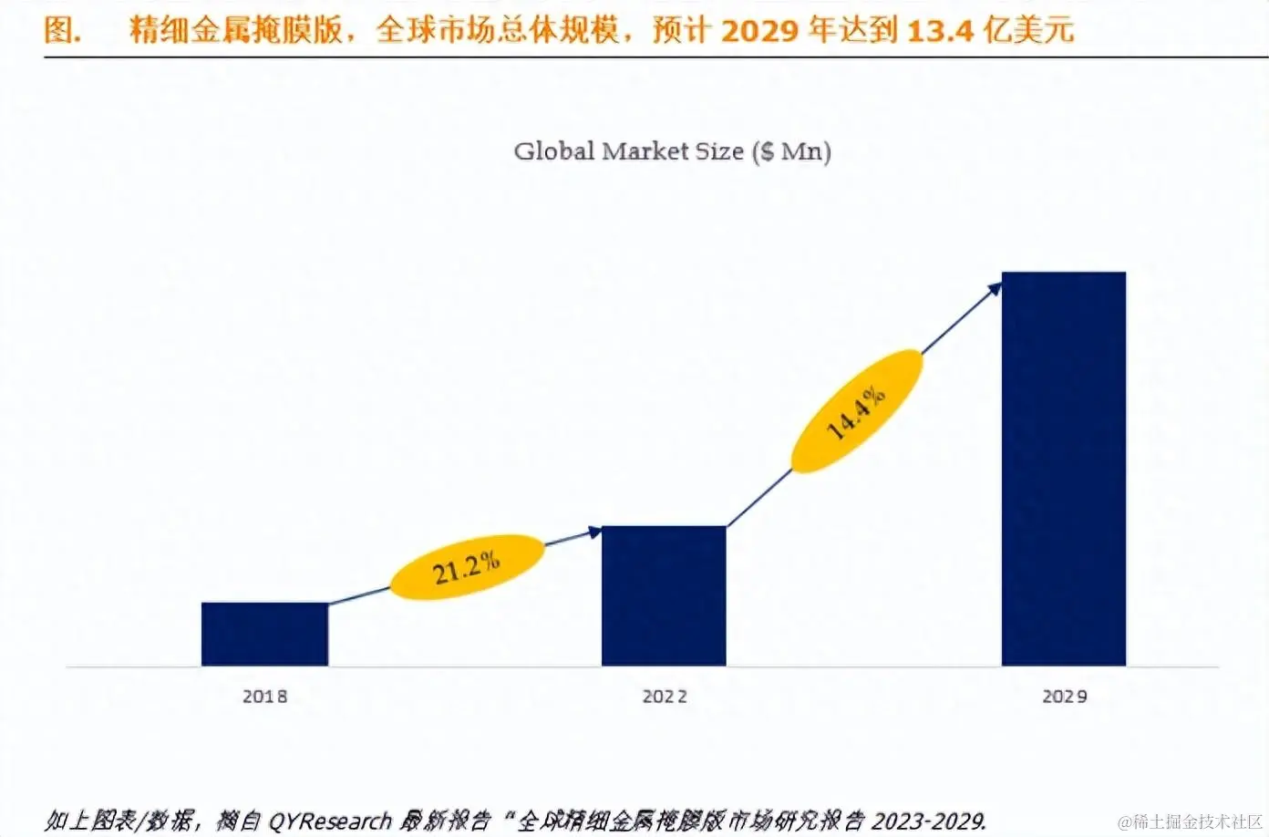 据QYResearch调研团队最新报告“全球精细金属掩膜版市场报告2023-2029”显示,预计2029年全球精细金属掩膜版市场规模将达到13.4亿美元,未来几年年复合增长率CAGR为14.4%。