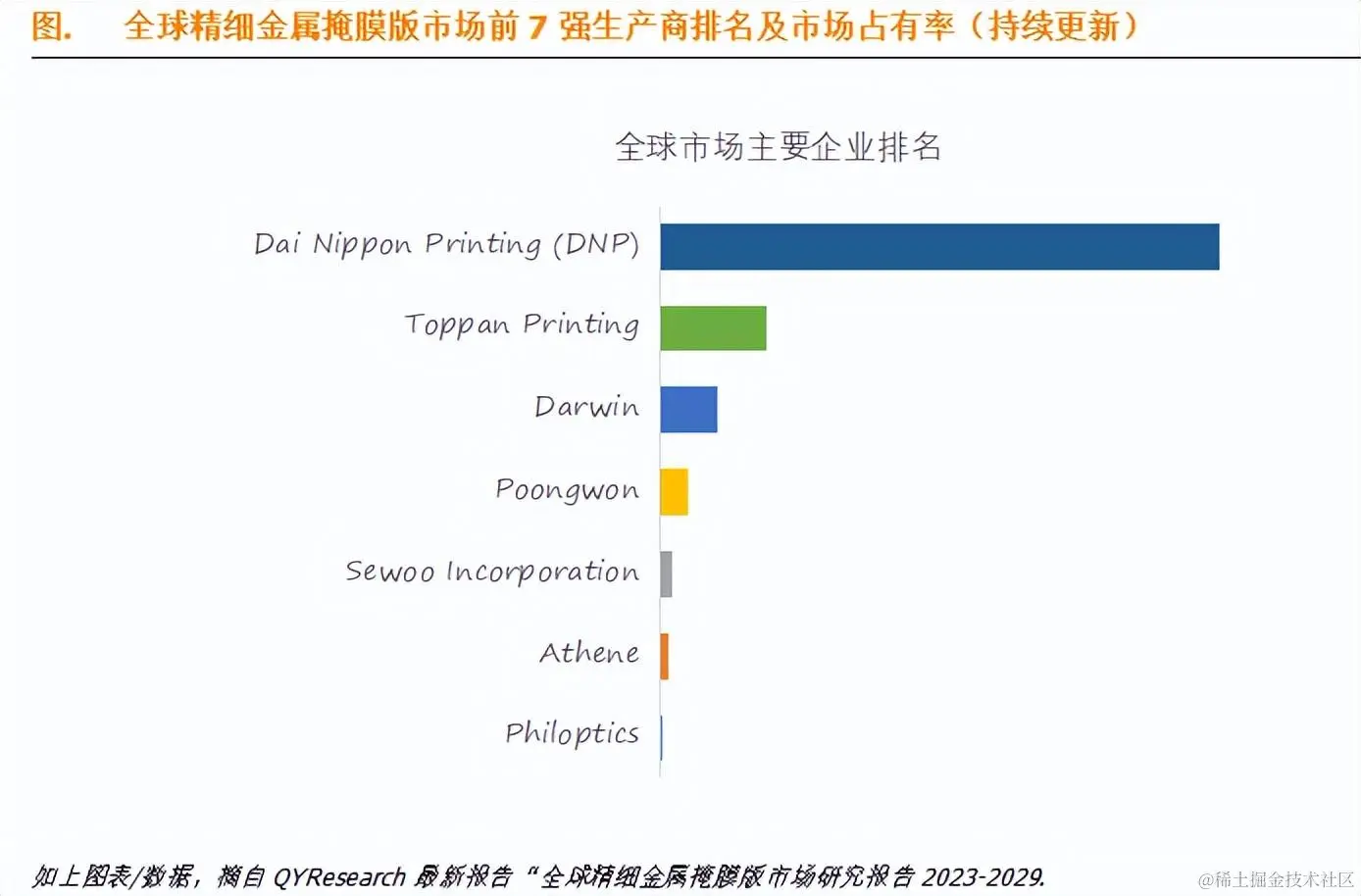 全球范围内精细金属掩膜版生产商主要包括Dai Nippon Printing (DNP)、Toppan Printing、Darwin等。2022年,全球前三大厂商占有大约92.0%的市场份额。