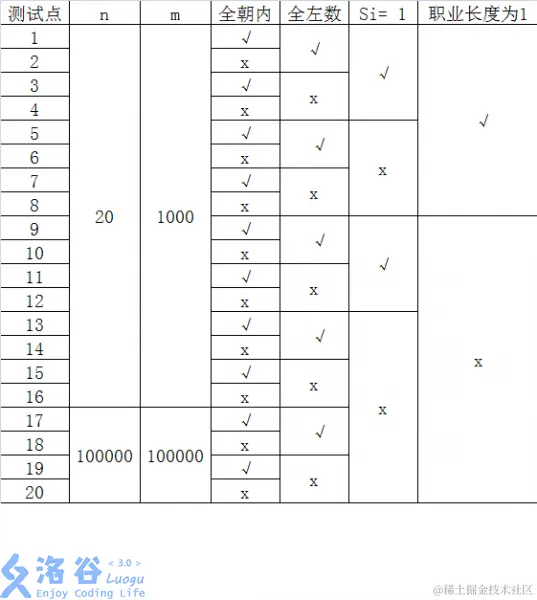 - s = 1 s=1 s=1:若为“√”,表示该测试点保证所有的指令都只数 1 1 1 个,即对任意的 1 ≤ z ≤ m , s i = 1 1\leq z\leq m,s_i=1 1≤z≤m,si=1;