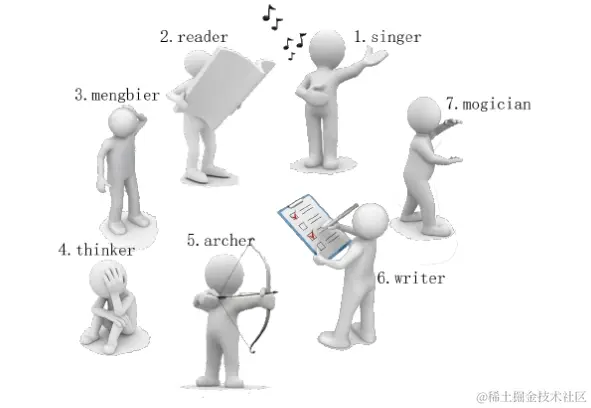 小南有一套可爱的玩具小人, 它们各有不同的职业。