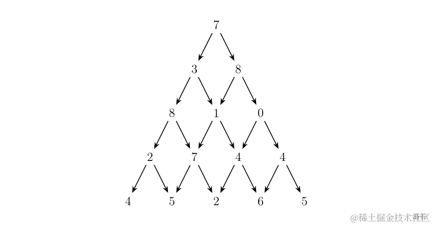 在上面的样例中,从 7 → 3 → 8 → 7 → 5 7 \to 3 \to 8 \to 7 \to 5 7→3→8→7→5 的路径产生了最大权值。