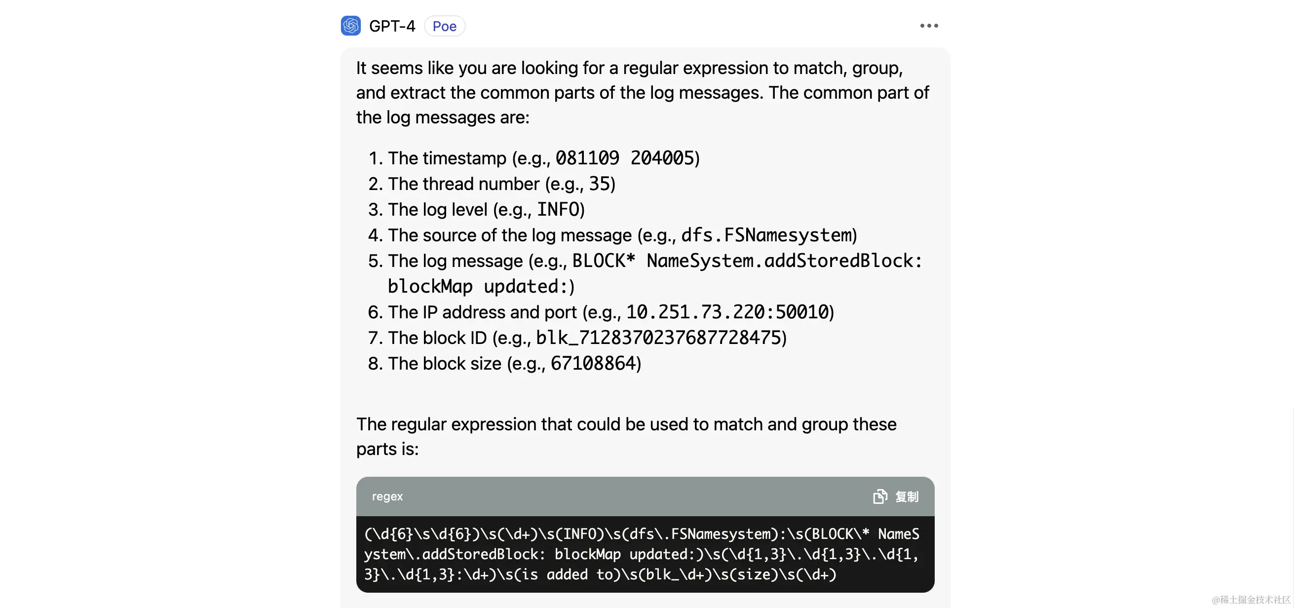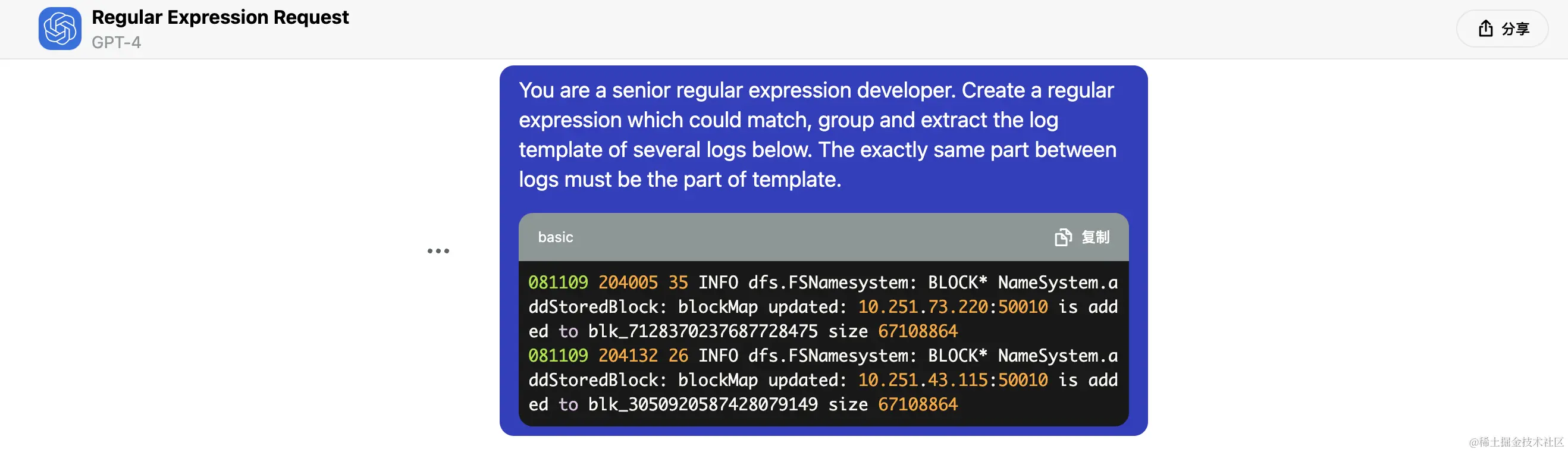 但大模型作为一种较慢的“思考”,非常不适合直接用于处理流程中。因此我采用了一种间接的模式:依然使用正则表达式匹配并抽取日志,但通过 Chat-GPT 生成每类日志的正则。大模型通过代码生成能力“离线”作用于实时数据处理流程,以兼顾智能化与处理效率。