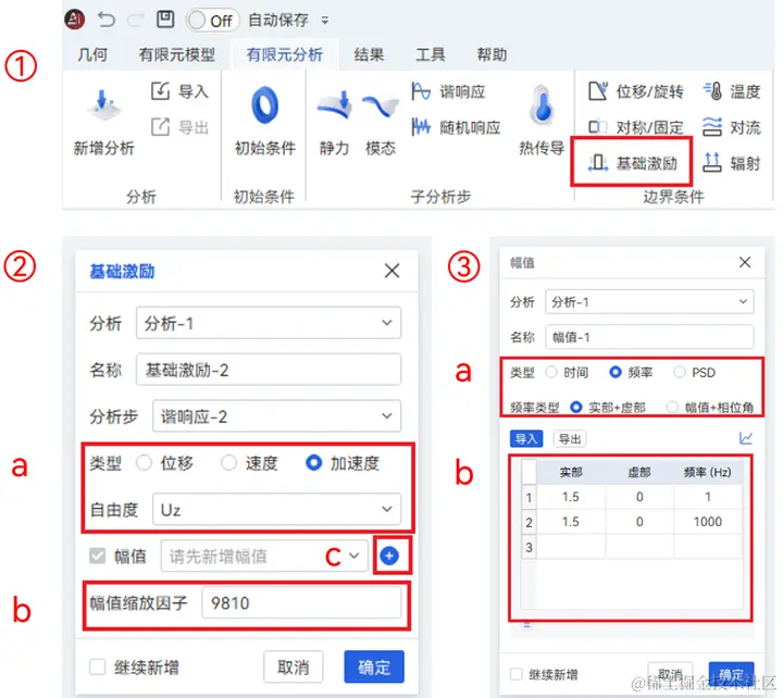 ② 在基础激励弹窗中,a.类型选择加速度,自由度选择Uz;b.缩放因子输入重力加速度9810;c.点击幅值“ + ”
