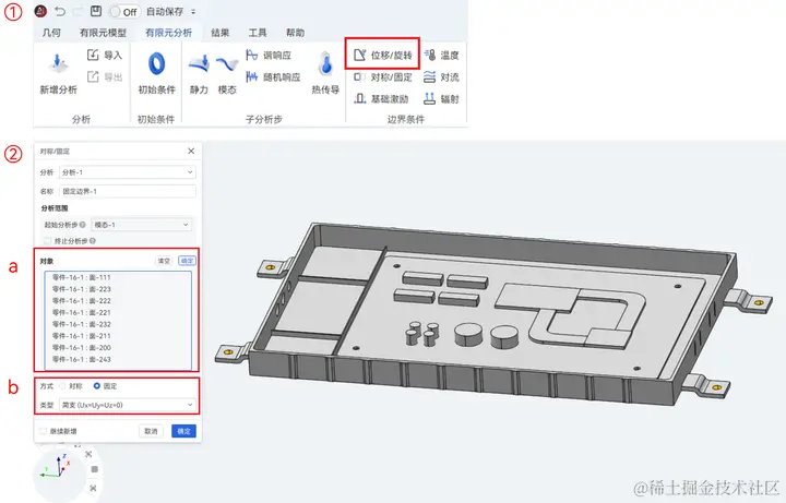 ② 在对称/固定弹窗中,a.选壳体4个安装孔(每个孔由两个半圆面组成);b.选择固定方式下的简支类型,点击确定。