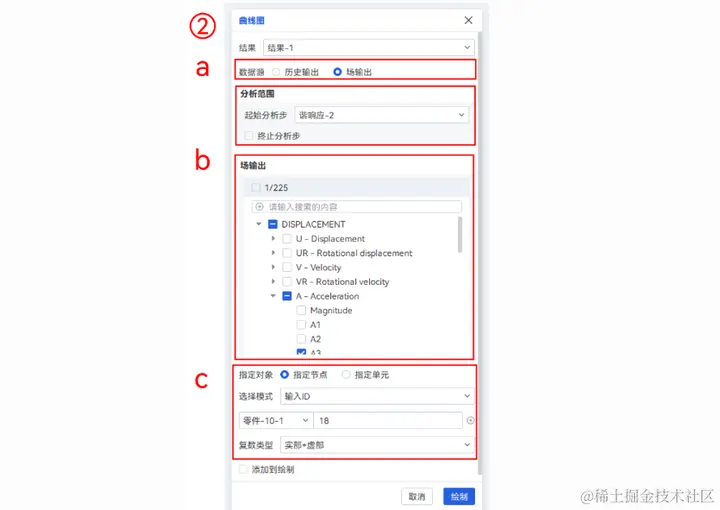 ② 在曲线图弹窗中,a.数据源选择场输出,起始分析步选择谐响应-2;b.场输出变量选择A3;c.选择指定节点、输入ID的方式指定对象,并选择零件-10-1的节点18;复数类型选择实部+虚部,点击绘制。