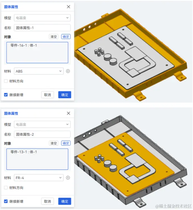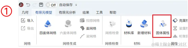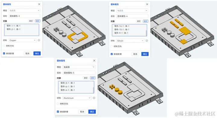 ① 点击有限元模型>固体属性。在固体属性弹窗中,依次将各材料属性赋予各几何。(可勾选弹窗中继续新增以快速赋予属性)
