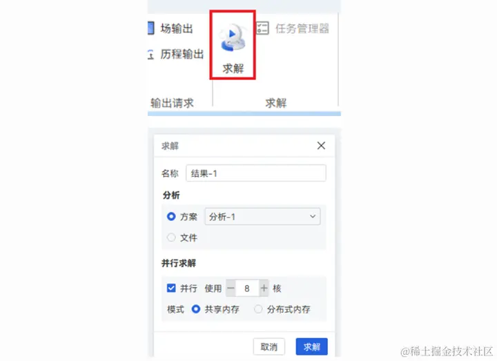 ② 在求解弹窗中,定义输出名称及求解模型,点击确定进行求解。