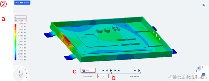 ③ a.在视口区左侧选择U及其下Magnitude;b.视口区下侧选择相应帧;c.输入相应变形系数,进行位移云图查看。