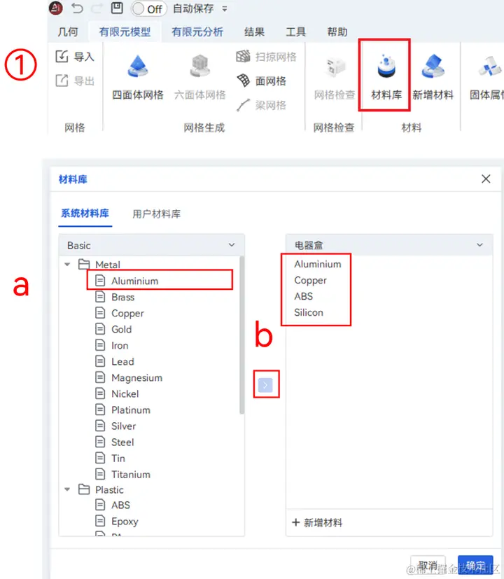 ① 点击有限元模型>材料库。在材料库弹窗中,a. 选择系统材料库中Aluminium、Copper、ABS和Silicon材料;b.依次点击’>’将其添加至模型材料库中;点击确定。