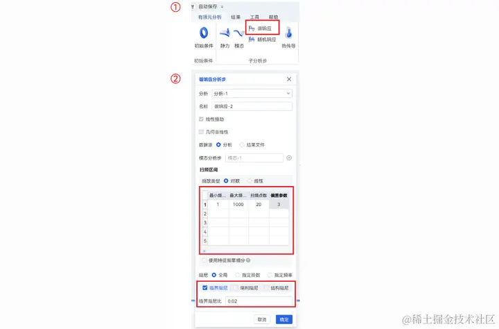 ② 在谐响应分析步弹窗中,a.输入最小频率、最大频率、扫频点数、偏置参数分别为1,1000,20,3;b.勾选临界阻尼,使用默认参数0.02。