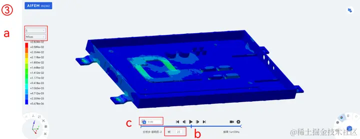 ② a.在视口区左侧选择S及其下Mises;b.视口区下侧选择相应帧;c.输入相应变形系数,进行应力云图查看;