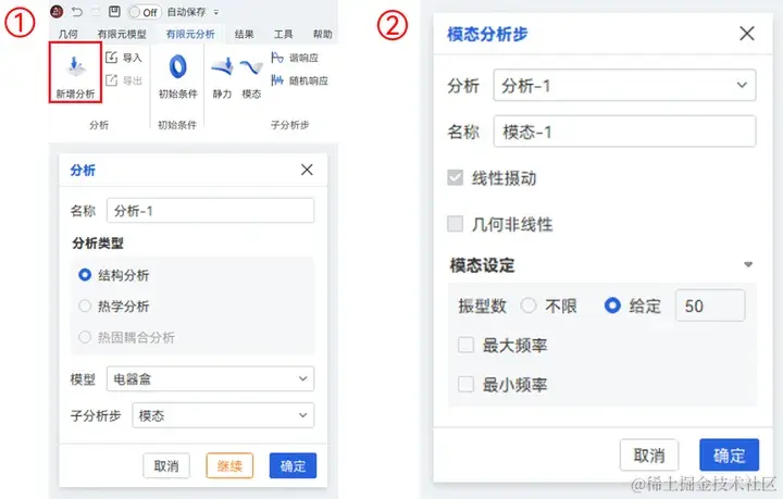 ① 点击有限元分析>新增分析,创建一个‘结构分析’ ,选择子分析步为模态,点击继续。
