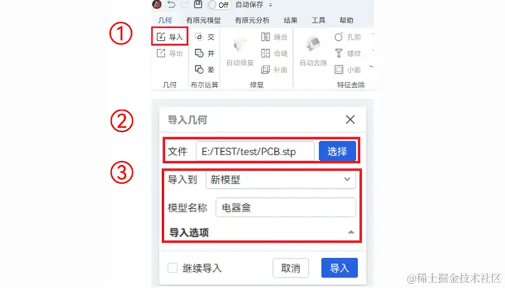 ① 点击几何>导入,弹出导入几何文件弹窗;
