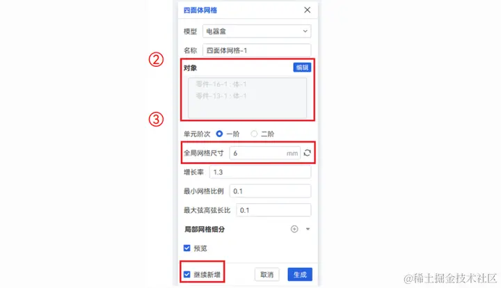 ③ 将全局网格尺寸修改为6mm,勾选继续新增,点击生成。