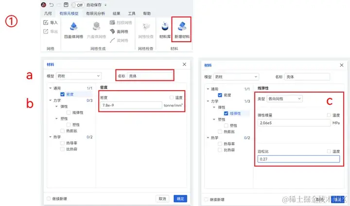 ① 点击有限元模型>新增材料,在材料弹窗中,a.修改材料名称为壳体;b.勾选密度并输入密度值为7.80E-9;c.勾选线弹性并输入弹性模量为2.06E5,泊松比为0.27。勾选继续新增按钮,点击确定。