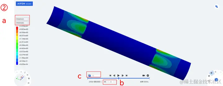 ② a.在视口区左侧选择RNMISES. b.视口区下侧选择相应帧,c.输入相应变形系数,进行RMS云图查看。
