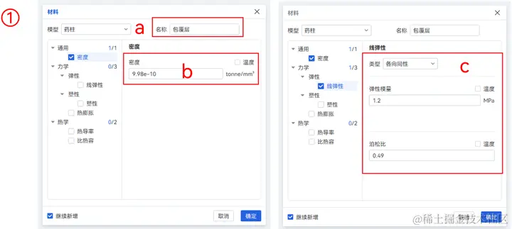 点击有限元模型>新增材料,在材料弹窗中,a.修改材料名称为包覆层;b.勾选密度并输入密度值为9.98E-10;c.勾选线弹性并输入弹性模量为1.2,泊松比为0.49。勾选继续新增按钮,点击确定。