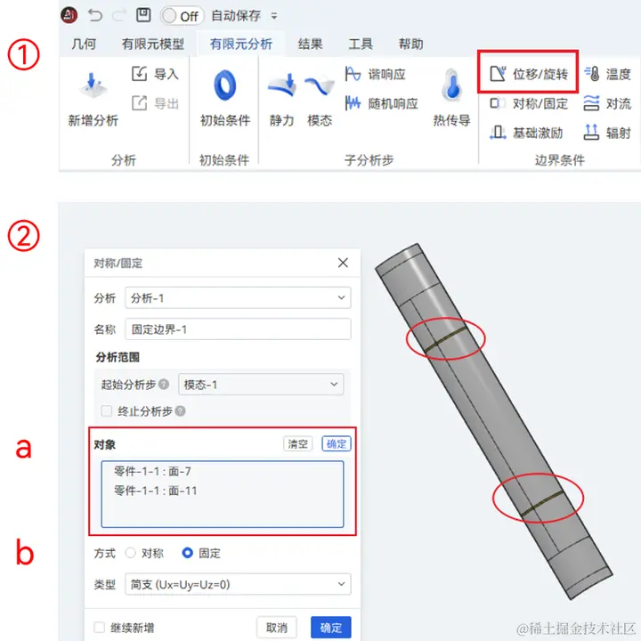 ② 在对称/固定弹窗中,a.选中间两个环边; b.选择固定方式下的简支类型,点击确定。