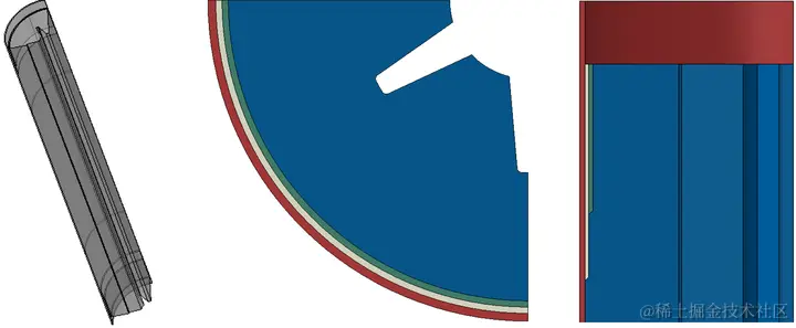 某型药柱几何如图1-1所示,取其四分之一模型进行分析,由红色壳体、灰色绝热层、绿色包覆层和蓝色推进剂组成。