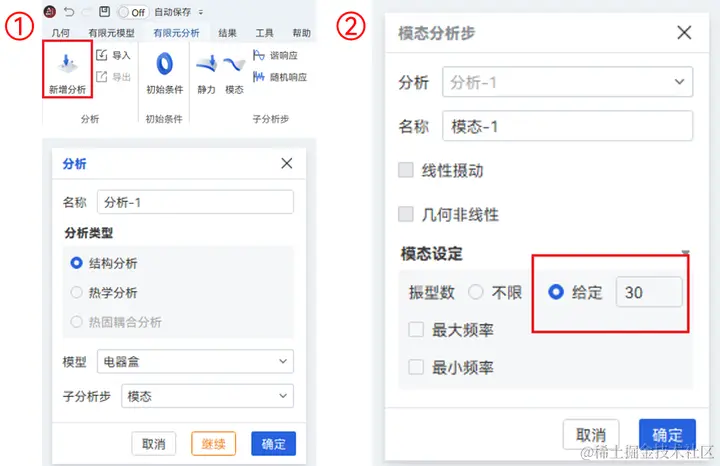 ① 点击有限元分析>新增分析,创建一个‘结构分析’ ,选择子分析步为模态,点击继续;