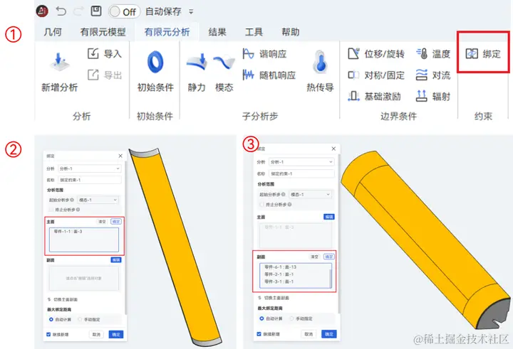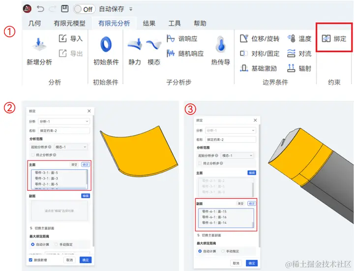 ① 再次点击有限元分析>绑定,弹出绑定弹窗(若勾选继续新增则会自动打开);