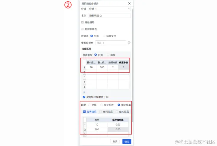 ② 在随机响应分析步弹窗中,a.输入最小频率、最大频率、扫频点数、偏置参数分别为10,500,2,3;b.选择指定频率,勾选临界阻尼,输入频率与临界阻尼比为10:0.03,500:0.03;点击确定。