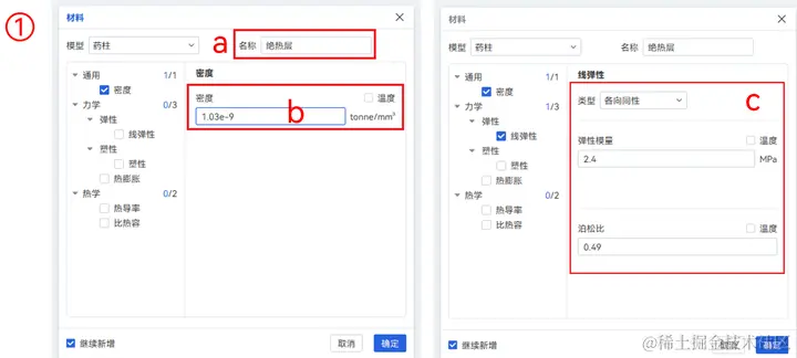 点击有限元模型>新增材料,在材料弹窗中,a.修改材料名称为绝热层;b.勾选密度并输入密度值为1.03E-9;c.勾选线弹性并输入弹性模量为2.4,泊松比为0.49。勾选继续新增按钮,点击确定。