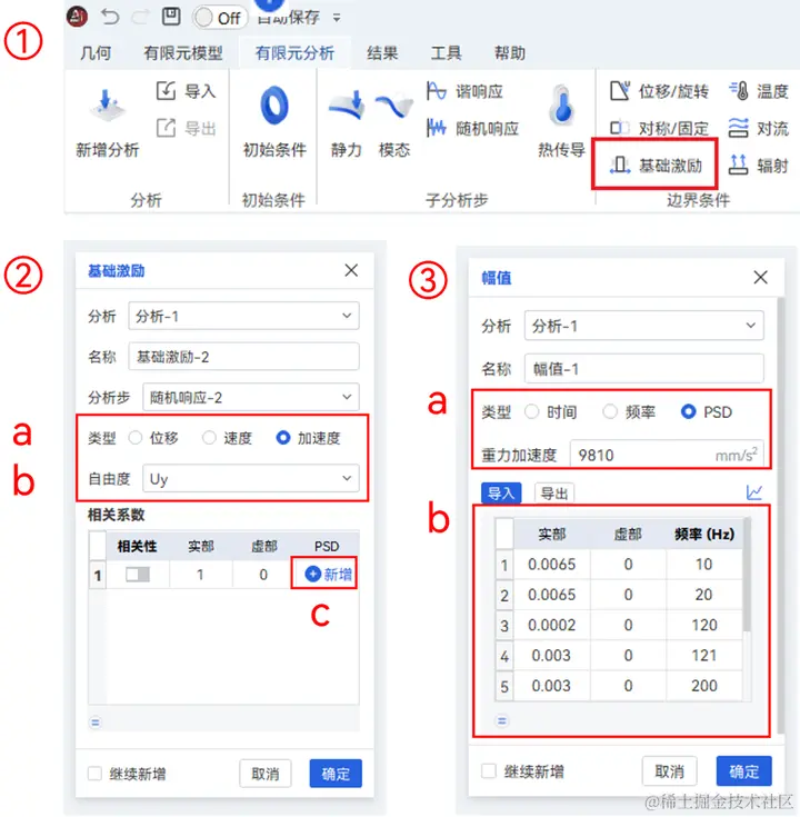 ② 在基础激励弹窗中,a.类型选择加速度;b.自由度选择Uy; c.点击PSD下侧“ + ”,弹出幅值弹窗以新建PSD;