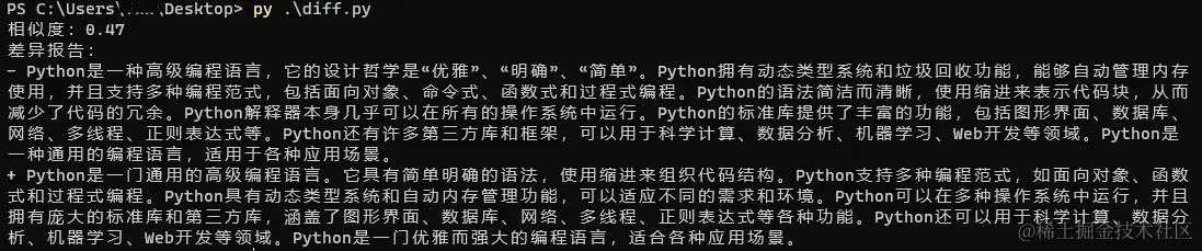 为了演示如何使用difflib库进行自动查重,我们可以用它来比较两篇文章的内容,并输出相似度和差异报告。假设我们有以下两篇文章: