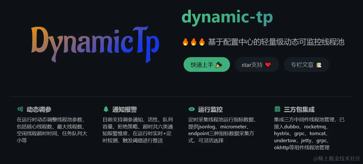 DynamicTp 是一个基于配置中心实现的轻量级动态线程池监控管理工具,主要功能可以总结为动态调参、通知报警、运行监控、三方包线程池管理等几大类。