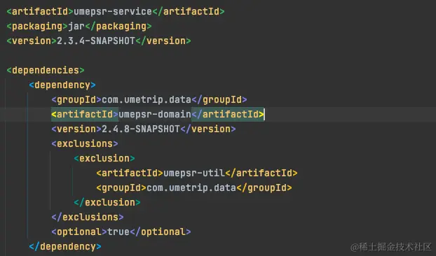 其实我一开始是忽略了这里,因为我们已经在本项目的pom中看到了,umepsr-service 版本为2.3.4-SNAPSHOT,这个优先级是最高的。