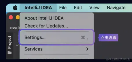 - Mac用户:在IntelliJ IDEA菜单下点击设置(Settings)。文件菜单下点击设置;Windows用户:在文件(File)菜单下点击设置(Settings)。
