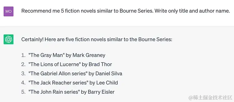 “Recommend me 5 fiction novels similar to the Bourne Series. Write only the title and author name.”
