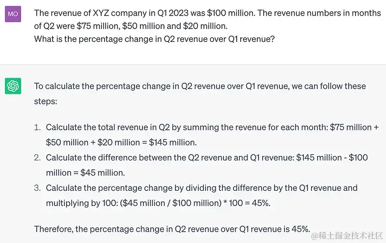在提示中注入数据或上下文是在 LLM 中使用自定义数据的最简单方法。 例如,在下图中,提示包含某公司 2023 年第一季度和 2023 年第二季度的销售数据。 LLM 的问题是返回销售额的百分比变化。