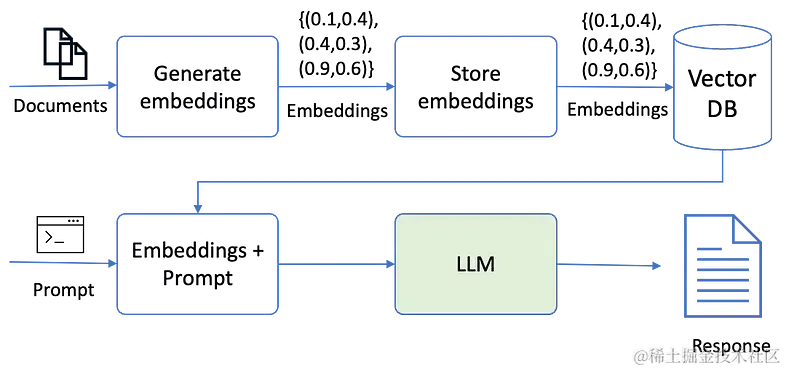 下图从概念上解释了如何使用这些嵌入来使用 LLM 从你的文档中检索信息。 首先,文档通过一个模型,该模型创建文档的小块,然后创建这些块的嵌入。 然后将这些嵌入存储在向量数据库中。 当用户想要查询 LLM 时,将从向量存储中检索嵌入并将其传递给 LLM。 LLM 使用嵌入从自定义数据生成响应。