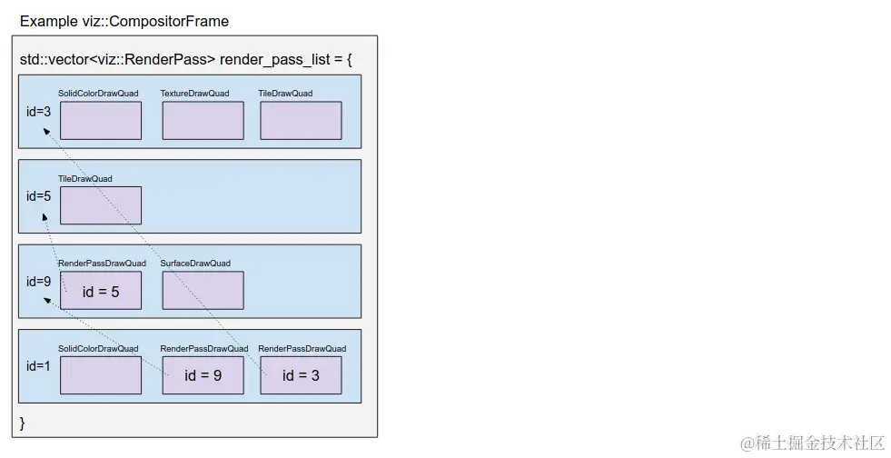 viz::TextureDrawQuad内部引用一个资源。viz::TileDrawQuad表示一个 Tile 块(Tile的概念见cc),和 TextureDrawQuad 类似,内部也引用一个资源,DisplayItemList 会被ccRaster 为 TileDrawQuad;viz::PictureDrawQuad内部直接存放 DisplayItemList,但是目前只能用于Android WebView;viz::SolidColorDrawQuad表示一个颜色块;viz::RenderPassDrawQuad内部引用另外一个 RenderPass 的 Id;viz::SurfaceDrawQuad内部保存一个 viz::SurfaceId,该 Surface 的内容由其他CompositorFrameSinkClient创建,用于 viz 的嵌套,比如 OOPIF,OffscreenCanvas等; 由于viz::RenderPassDrawQuad的存在使得 CF 中可以存储一个 RenderPass 树,由于viz::SurfaceDrawQuad的存在使得viz可以实现UI的夸进程嵌套。