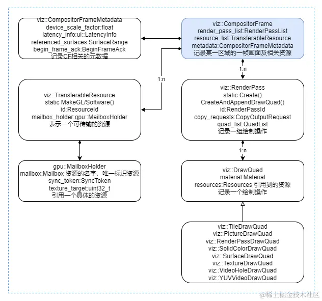 viz 的初始化只是一次性的过程,而且比较枯燥,所以放到最后再介绍。先来看一下 viz::CompositorFrame(简称 CF) 的创建,因为它是 viz 中的核心数据结构。