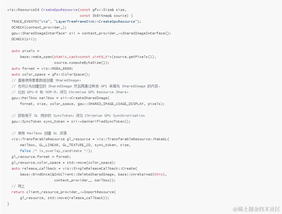 上面的代码将 SkBitmap 中的像素数据使用 gpu::SharedImageInterface 接口放入 SharedImage 中,然后使用它返回的 Mailbox 创建 viz::TransferableResource。就像代码中注释的那样,不一定非要使用像素数据来创建 SharedImage,也可以使用 GPU-R 和 OOP-R 相关接口来创建 SharedImage。关于 Mailbox,SharedImage 以及 GPU-R 和 OOP-R 的相关内容可以参考Chromium GPU Resource Share (Shared Image)。