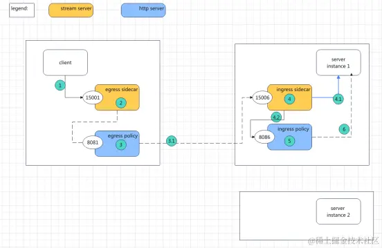 3.egress policy是个7层的代理server,它会挑选合适的后端真实的server地址,(此例中, server instance1, ip:10.0.30.1 或 instance2, ip:10.0.30.2). 假设选中server1后 ,它会连接 10.0.30.1:8080,并发送请求。