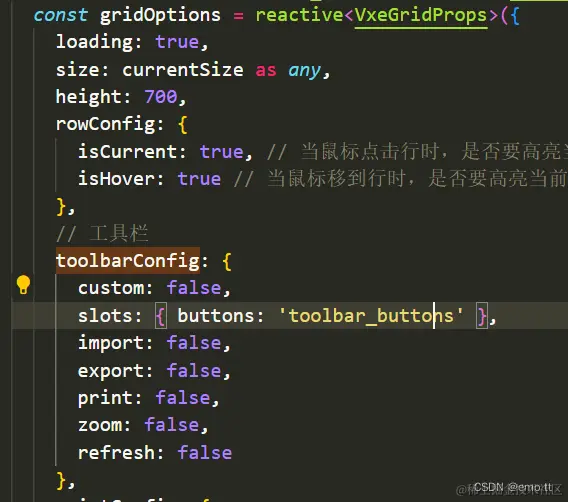 vxe-grid - 去除工具栏 江城开朗的豌豆 2023-11-01 204 阅读1分钟 toolbarConfig: { custom: false, slots: { buttons: 'toolbar_buttons' }, import: false, export: false, print: false, zoom: false, refresh: false },