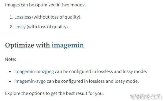 ImageMinimizerWebpackPlugin 可用于使用 优化/压缩 所有图像,它可以支持 无损(不损失质量) 、有损(质量下降) 两种模式的压缩方式。