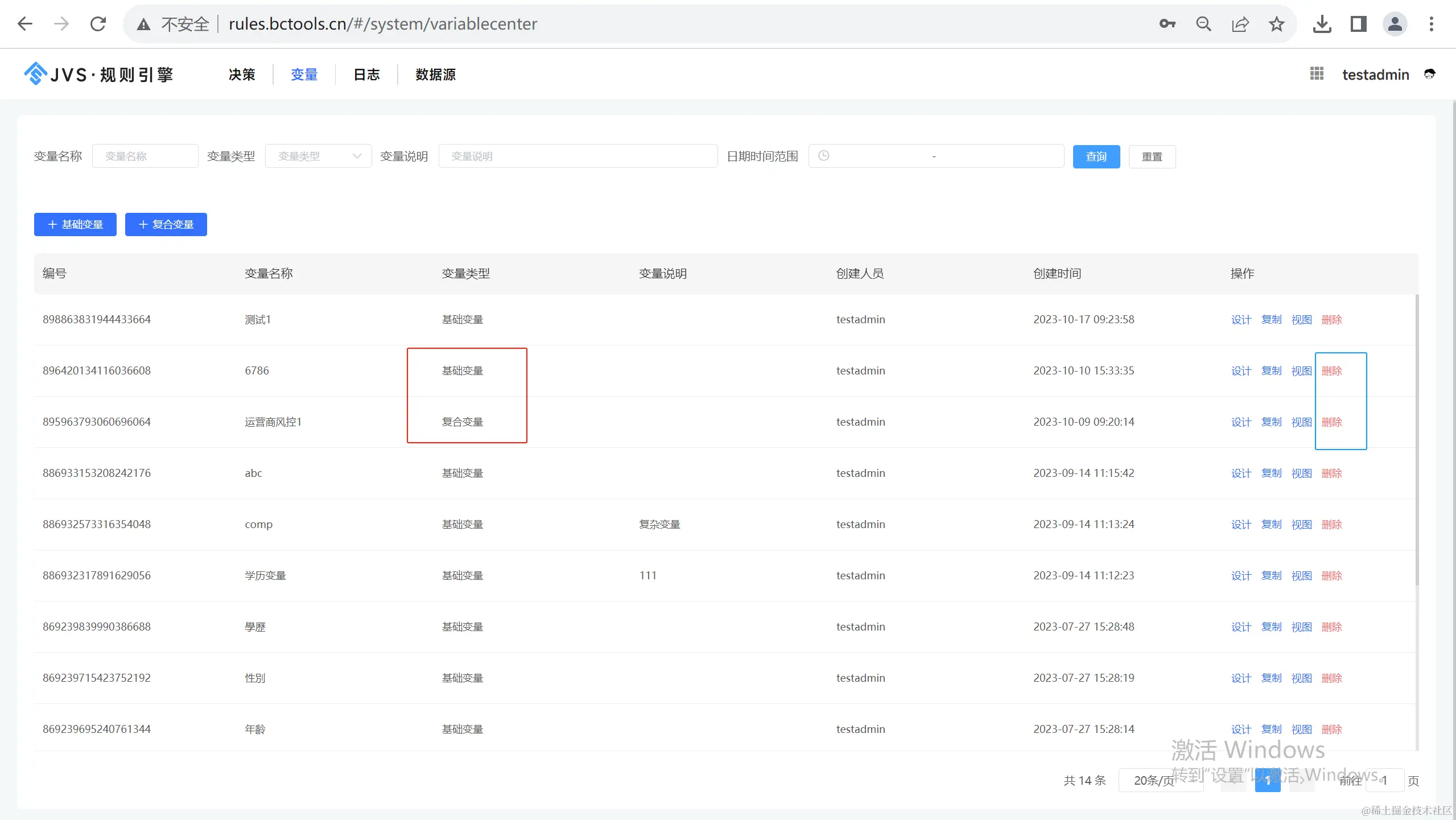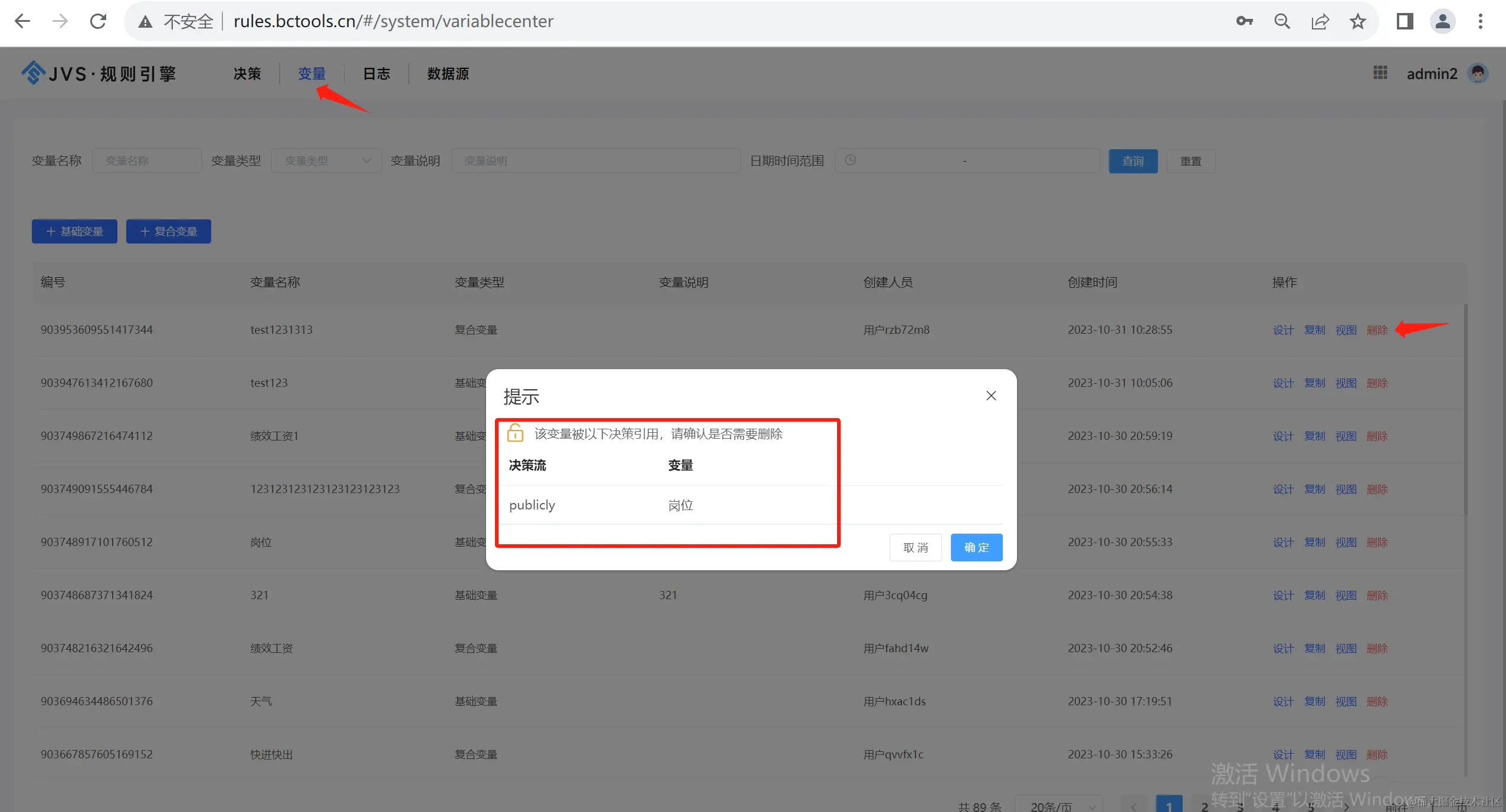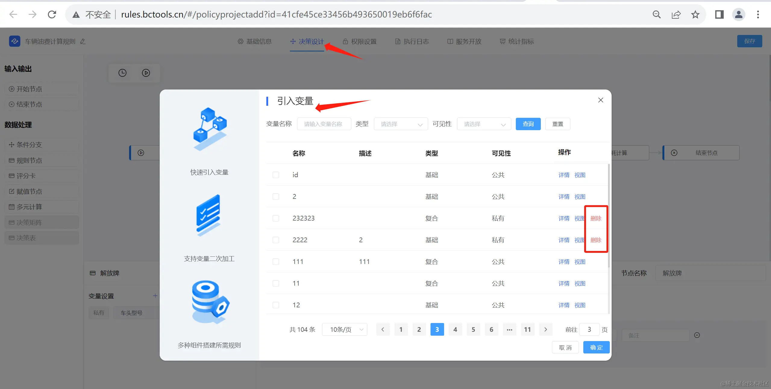 变量页面,删除功能时可查看变量详情