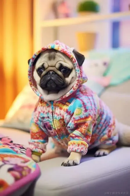 免费的穿连体衣小狗Midjourney提示词 这是我的简单的穿连体衣小狗Midjourney提示词!我选择了巴哥犬作为这个提示词的对象,但请确保根据你最喜欢的狗品种进行更改。