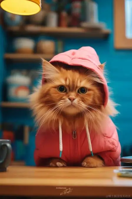 一张毛茸茸可爱的红色猫戴着小毛帽,坐在厨房柜台上,背景是橙色和蓝色的淡彩色调。