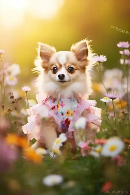 一张毛茸茸可爱的吉娃娃犬穿着花裙的候机照,站在开满鲜花的田野中,背景是树木,颜色以淡彩色调为主。