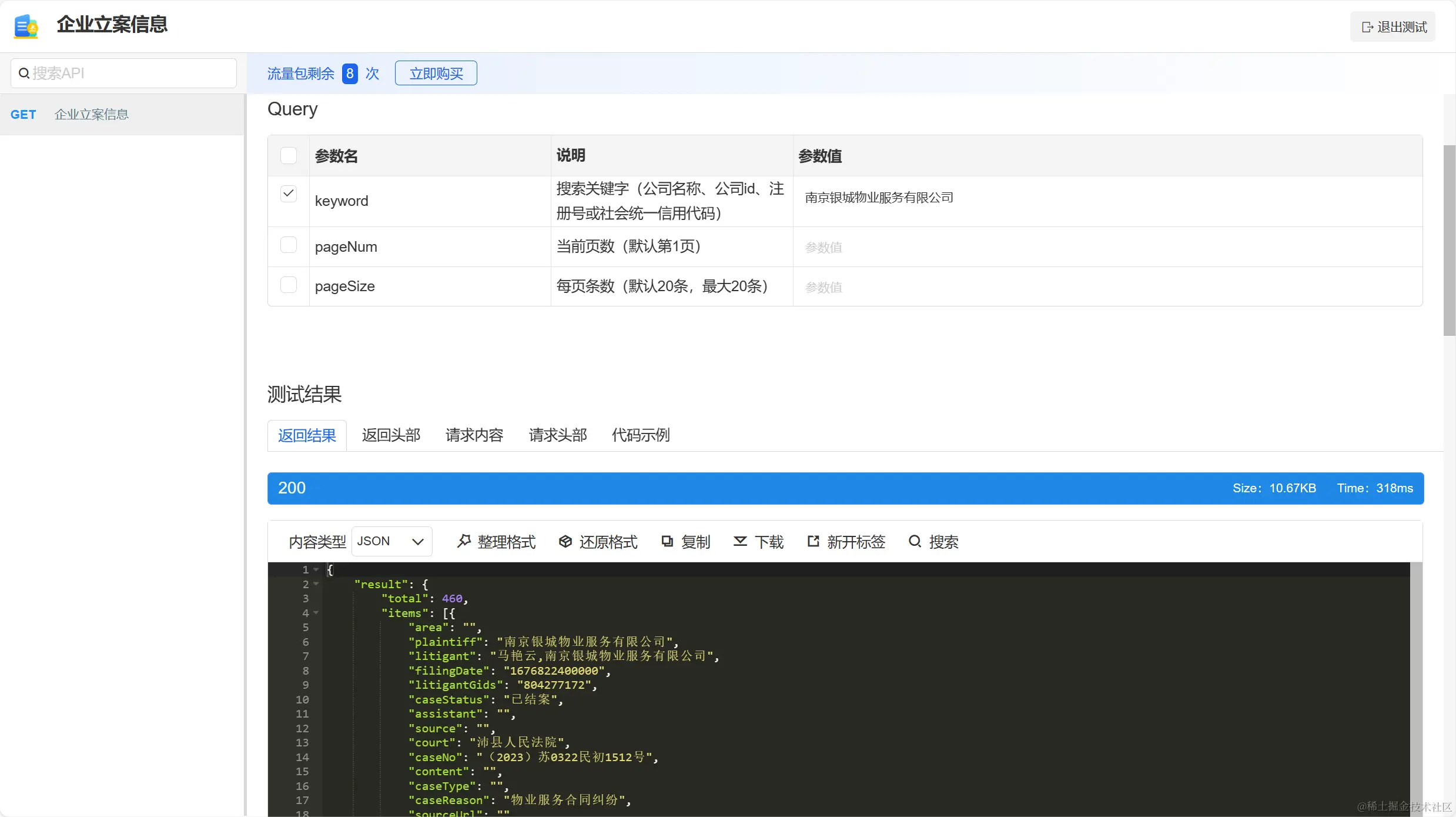 申请接口成功,进入测试页面,输入要查询的企业即可快速在线查询企业的网站备案信息,测试接口的性能。