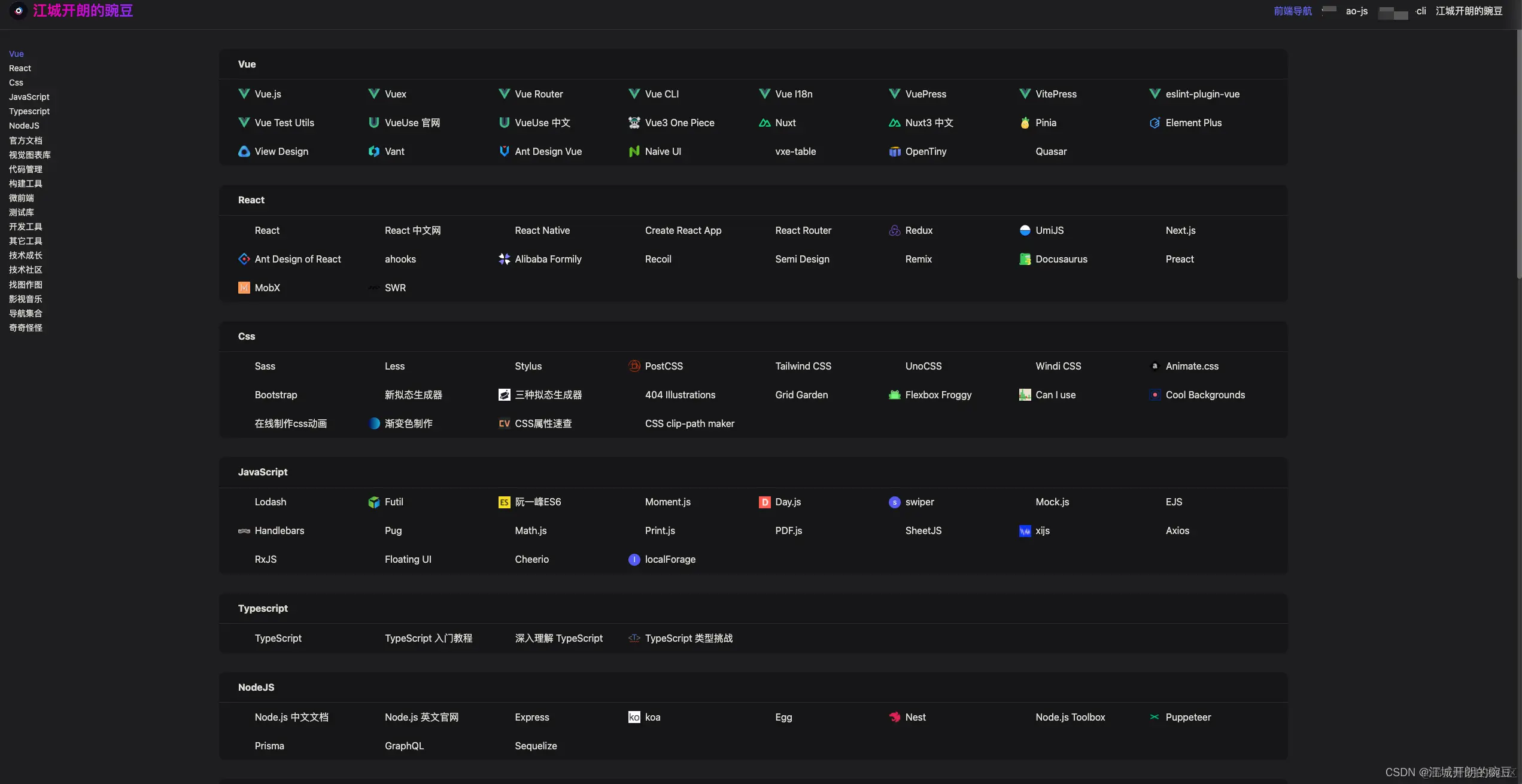 前端导航 就是把一些常用的网站都收集起来了,做成了导航的形式,省的到处找文档,工作过程中发现好用的网站都会一点点加到里面去的。