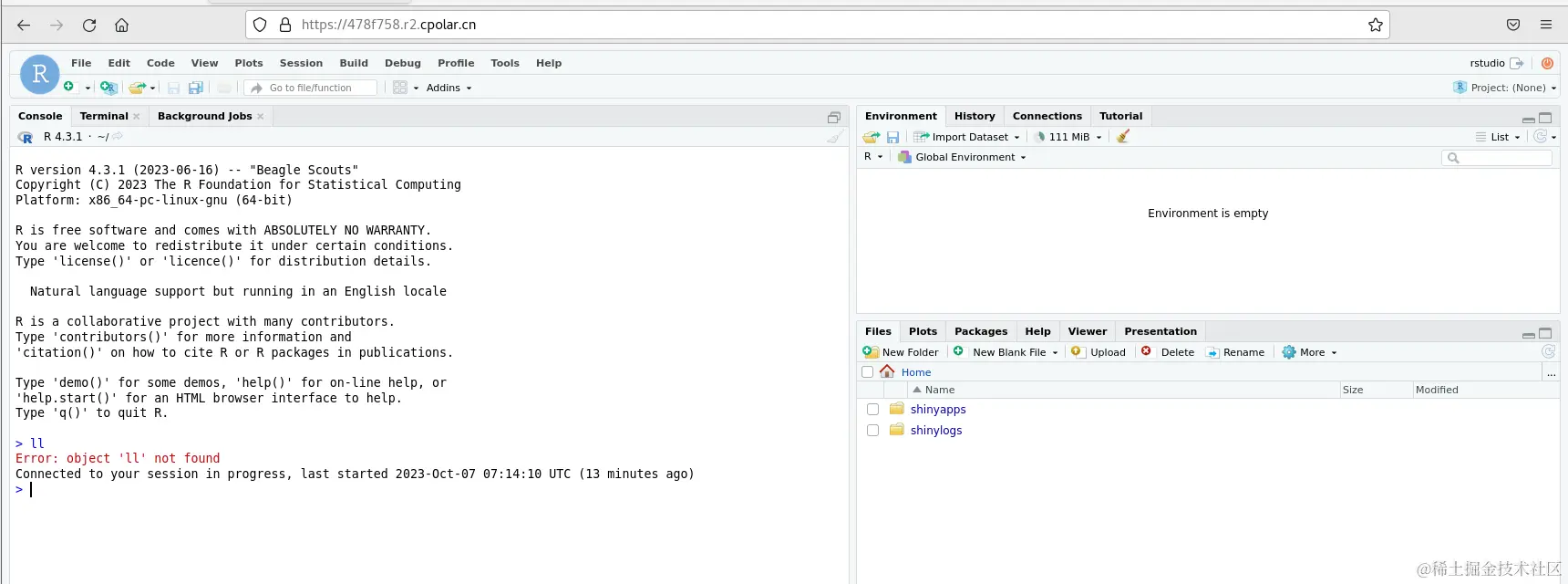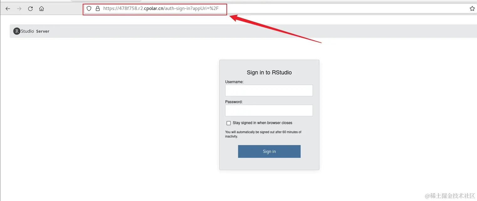 最后,我们使用固定的公网地址访问RStudio工具,可以看到访问成功,这样一个固定且永久不变的公网地址就设置好了,新地址访问,可能需要重新登录!