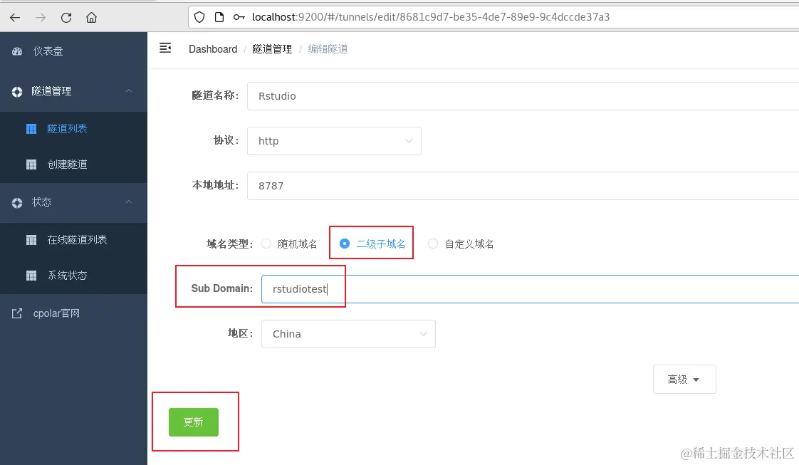 修改隧道信息,将保留成功的二级子域名配置到隧道中