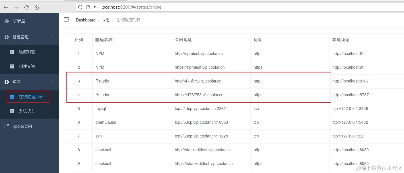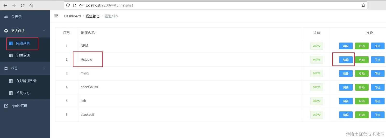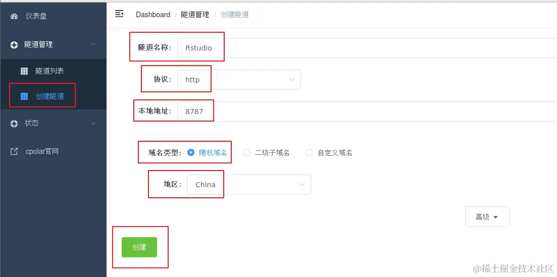 点击左侧仪表盘的隧道管理——创建隧道,创建一个RStudio 的cpolar 公网地址隧道!